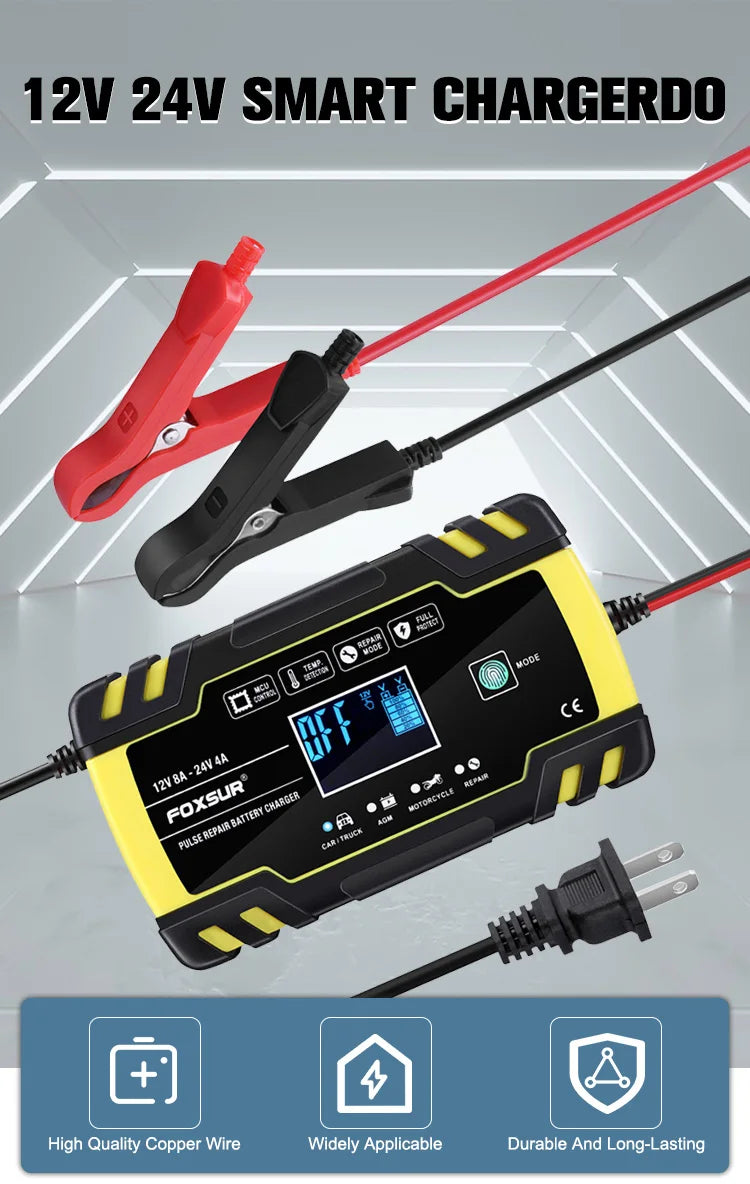 The FOXSUR High-Frequency Battery Charger provides robust protection against electrical risks. With adaptable 3-stage chargers, it suits diverse battery types and uses. Engineered for 12V and 24V batteries, it autonomously adjusts charging for various voltage conditions. Moreover, it acts as a battery maintainer, enhancing longevity with a pulse repair feature. Supported by warranty, FOXSUR assures customer contentment and assistance. Remember to peel off the protective film for a pristine screen.