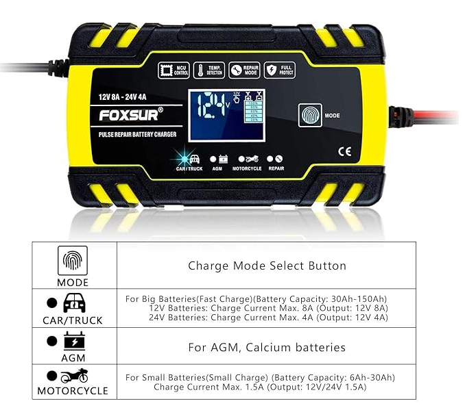 This 3-stage chargers suitable for most battery types, including Calcium, Gel, AGM, and Wet batteries