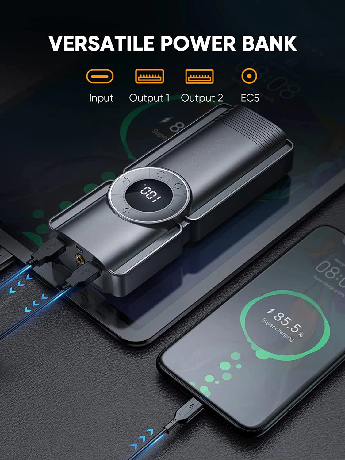 This device is a great addition for any vehicle or backpack, especially for biking or motorcycling. It’s easy to use: just set the desired PSI, and it inflates accurately. Best for one tire, it may handle two. Pair it with a tire plug kit for quick fixes. It charges via Type-C and feels sturdy, ensuring peace of mind in emergencies..