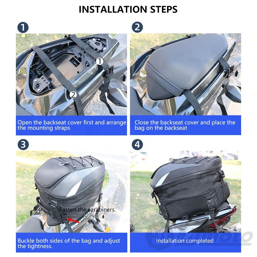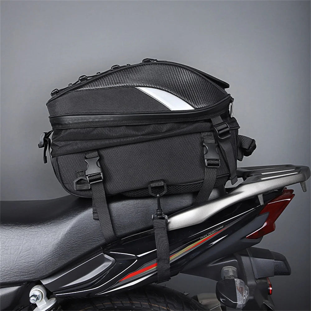 Motoztar presents the ultimate solution tailored for riders who prioritize safety and convenience. This capacious bag provides ample storage space for crucial items such as helmets, wallets, phones, cameras, energy drinks, cigarettes, and much more. With Motoztar's tail bag, riders can confidently embark on their adventures, knowing their valuables are securely stowed and readily accessible.